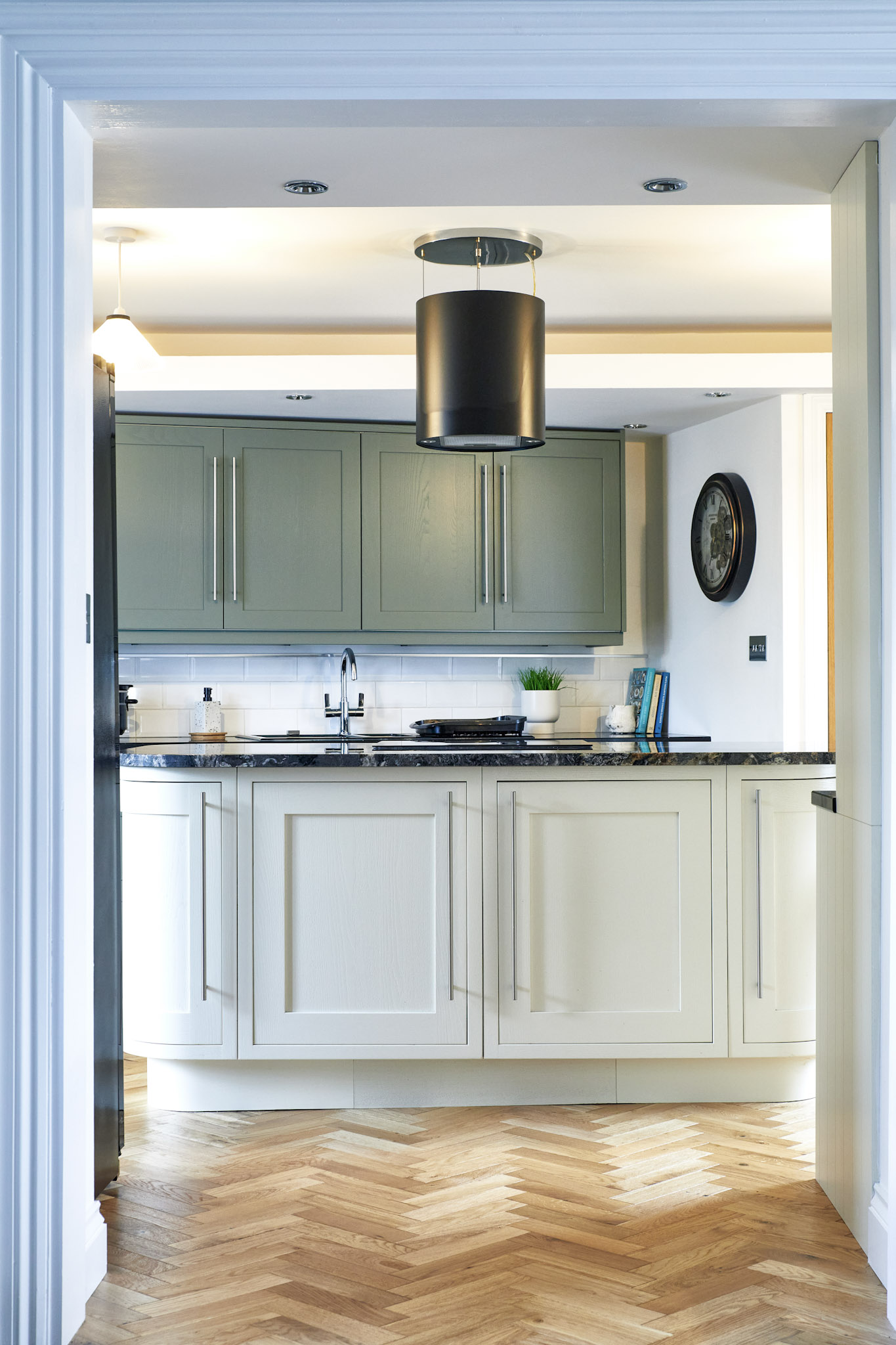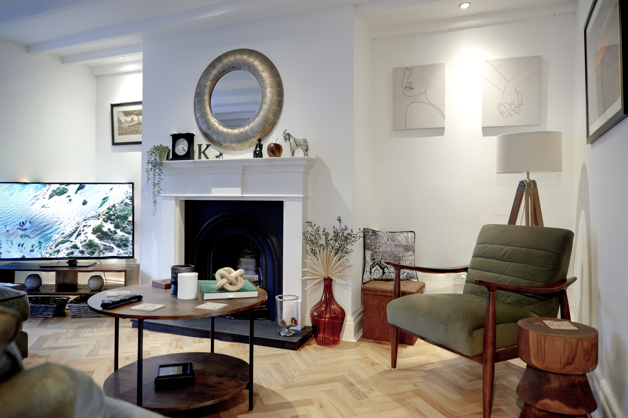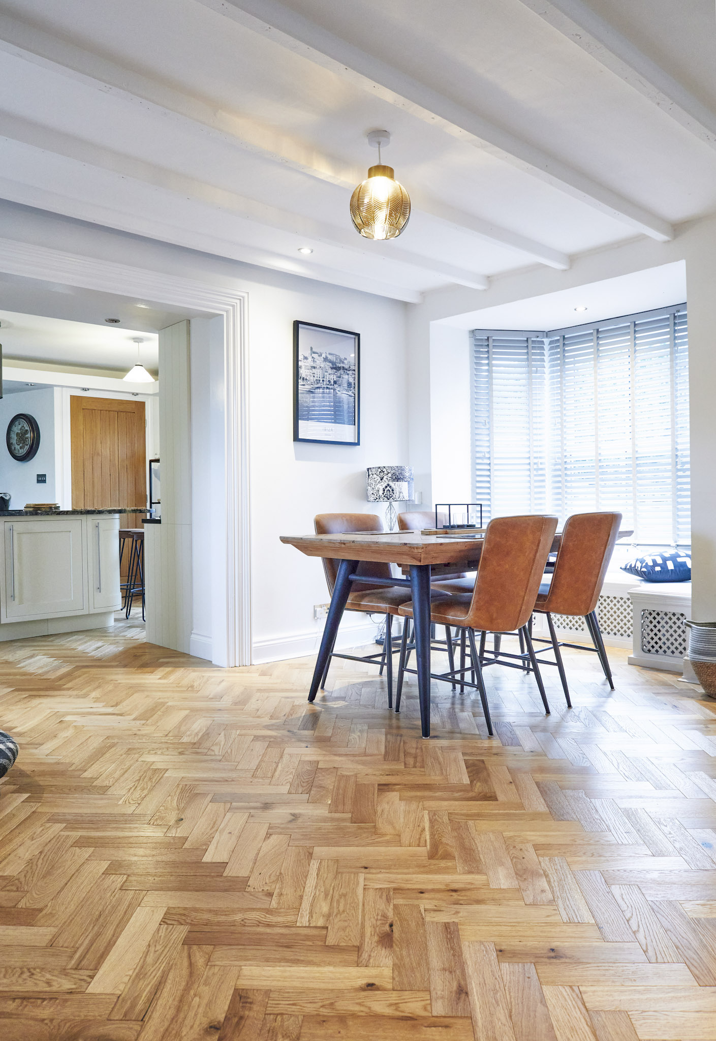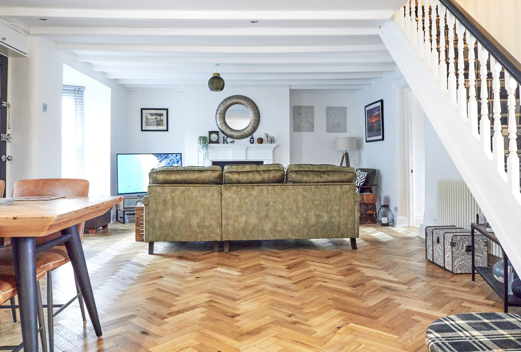 The transformation centred around unifying the home through layout improvements and consistent, high-end finishes. The introduction of herringbone timber flooring throughout the ground floor creates visual continuity and warmth, while the redesigned kitchen combines muted cabinetry, stone worktops, and statement lighting to form a functional yet stylish focal point. The staircase was refreshed to enhance the sense of craftsmanship, and living areas were redefined to feel open but still intimate. Upstairs, the loft bathroom was converted into a bright, spa-like retreat featuring a freestanding bath, skylight, and bespoke detailing, turning previously underutilised space into one of the home’s standout features. The result is a fully modernised interior that enhances both everyday living and long-term property value.
