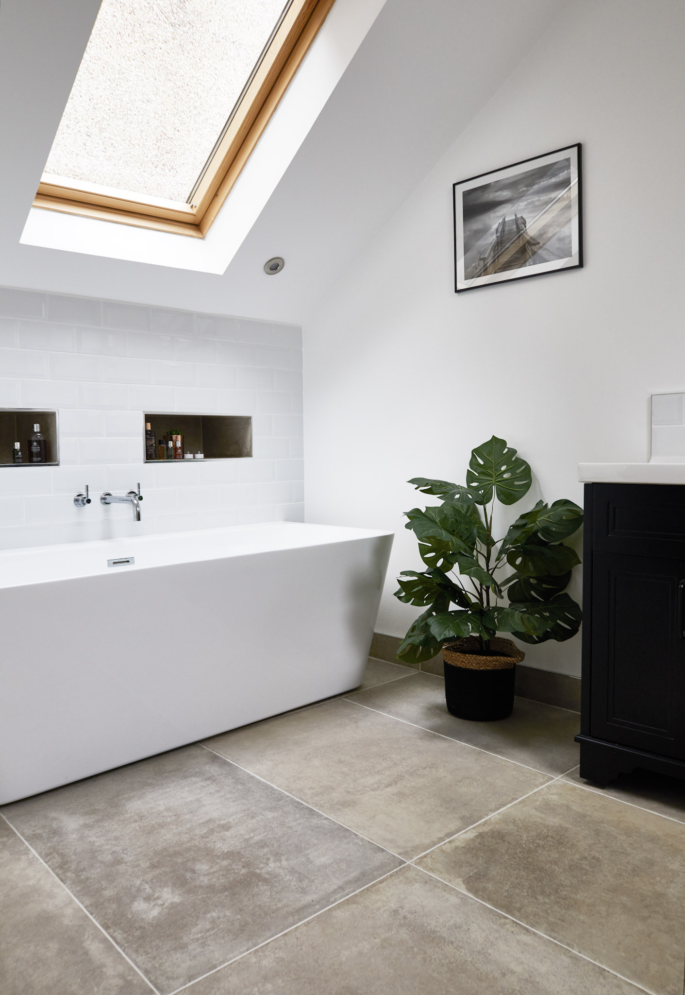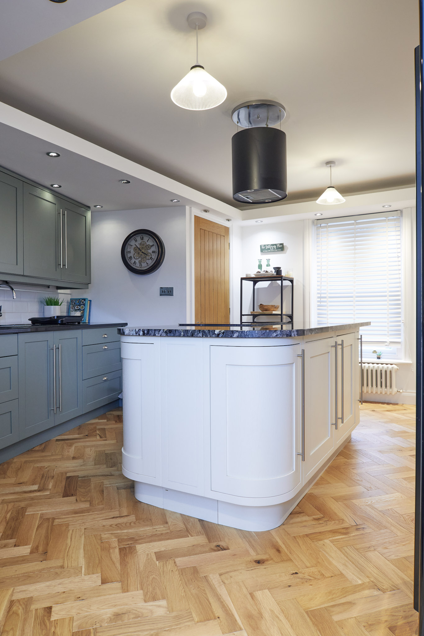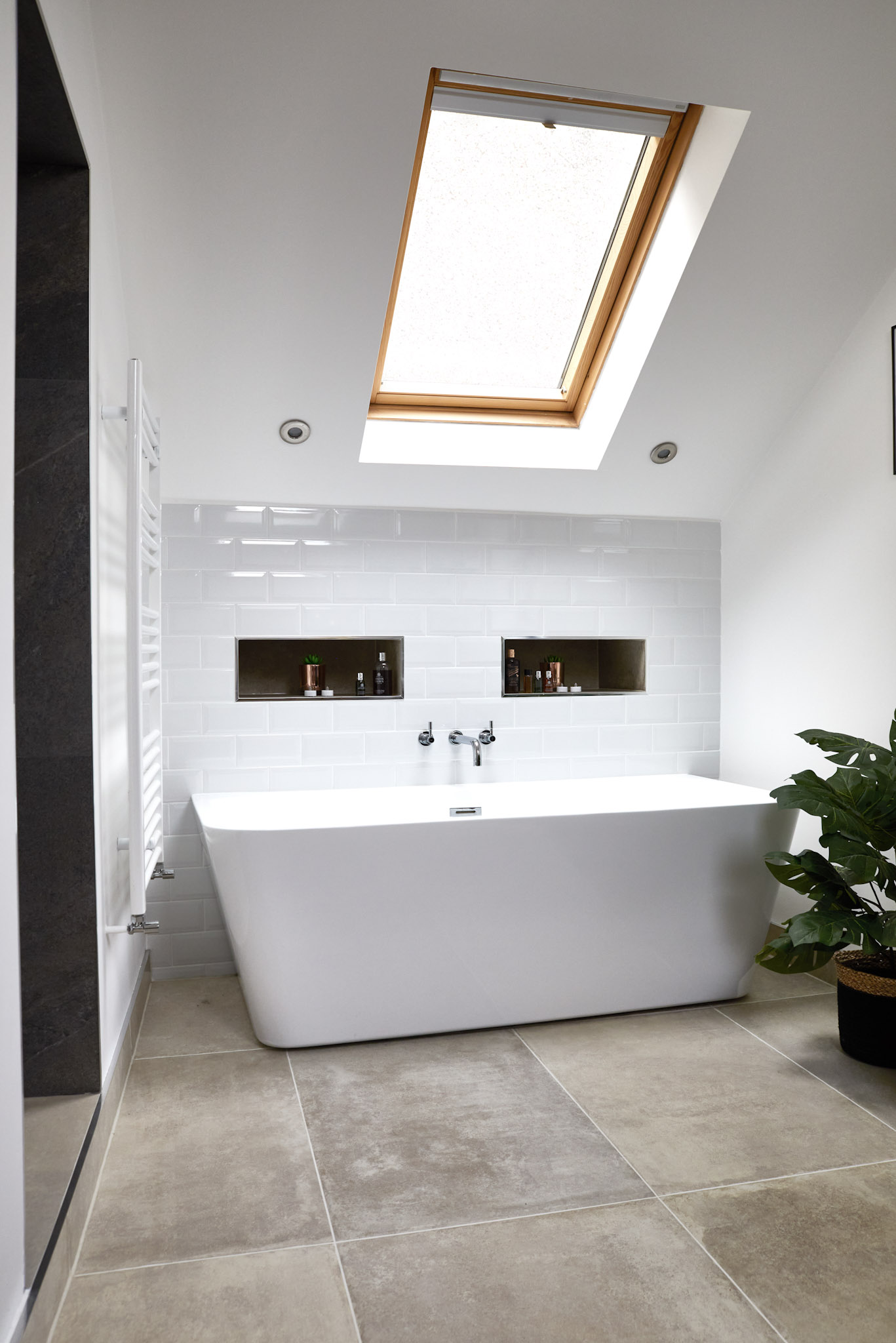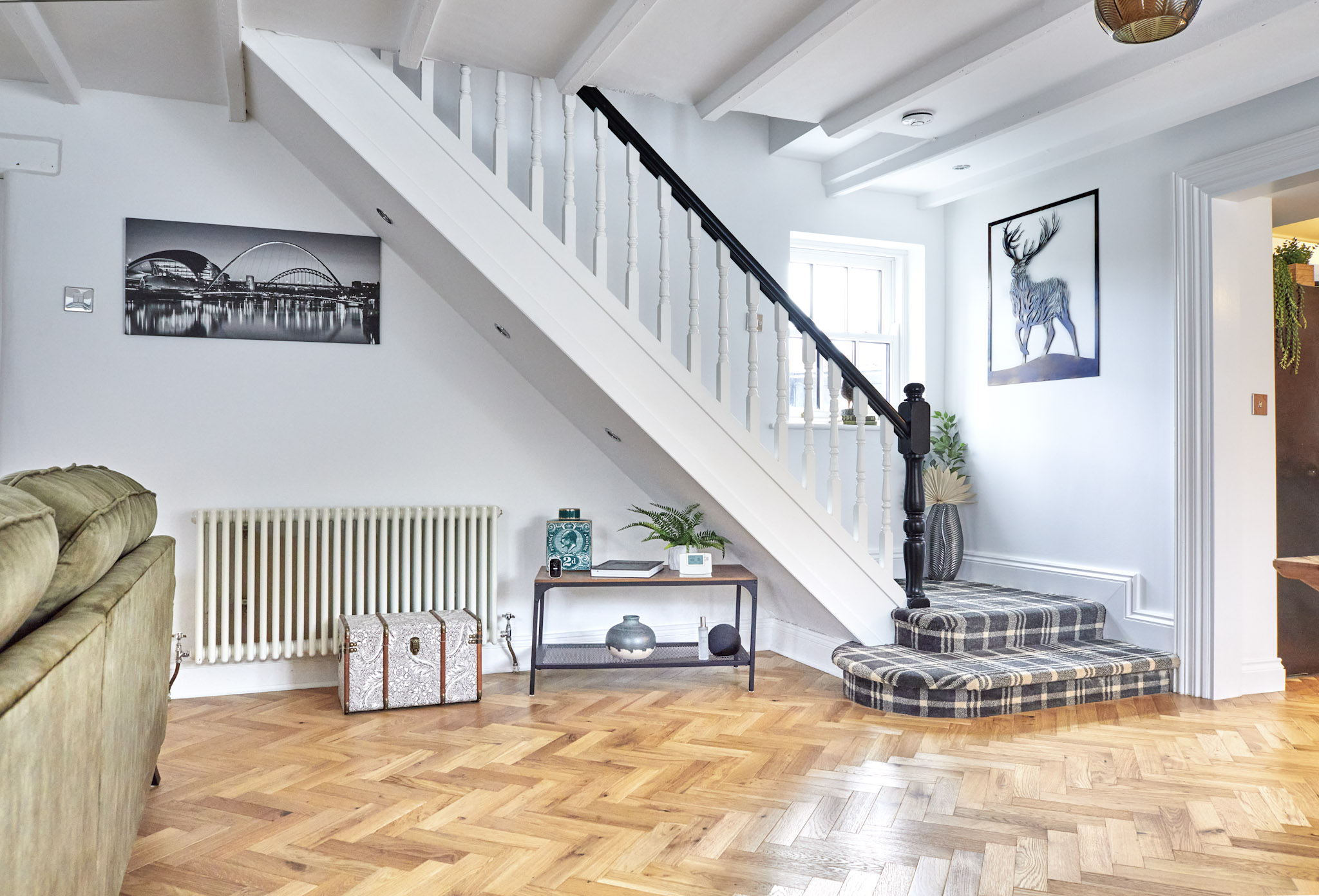 The transformation centred around unifying the home through layout improvements and consistent, high-end finishes. The introduction of herringbone timber flooring throughout the ground floor creates visual continuity and warmth, while the redesigned kitchen combines muted cabinetry, stone worktops, and statement lighting to form a functional yet stylish focal point. The staircase was refreshed to enhance the sense of craftsmanship, and living areas were redefined to feel open but still intimate. Upstairs, the loft bathroom was converted into a bright, spa-like retreat featuring a freestanding bath, skylight, and bespoke detailing, turning previously underutilised space into one of the home’s standout features. The result is a fully modernised interior that enhances both everyday living and long-term property value.